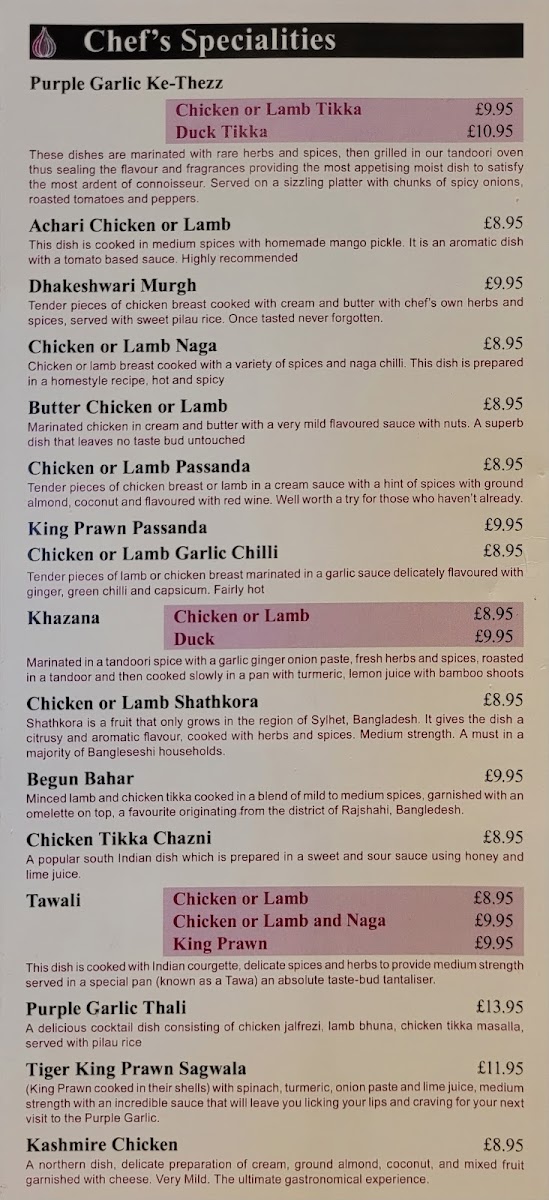 Welcome to Purple Garlic, a culinary gem nestled in Melton Mowbray. This restaurant promises an unforgettable dining experience, rich with flavor and warmth, as echoed by delighted customers. The menu features an extensive array of starters, including the tantalizing Kebab Platter for 2 and delightful Onion Bhaji. For those seeking something special, the chef’s specialties like Achari Chicken and Butter Chicken take center stage, ensuring a burst of authentic tastes.